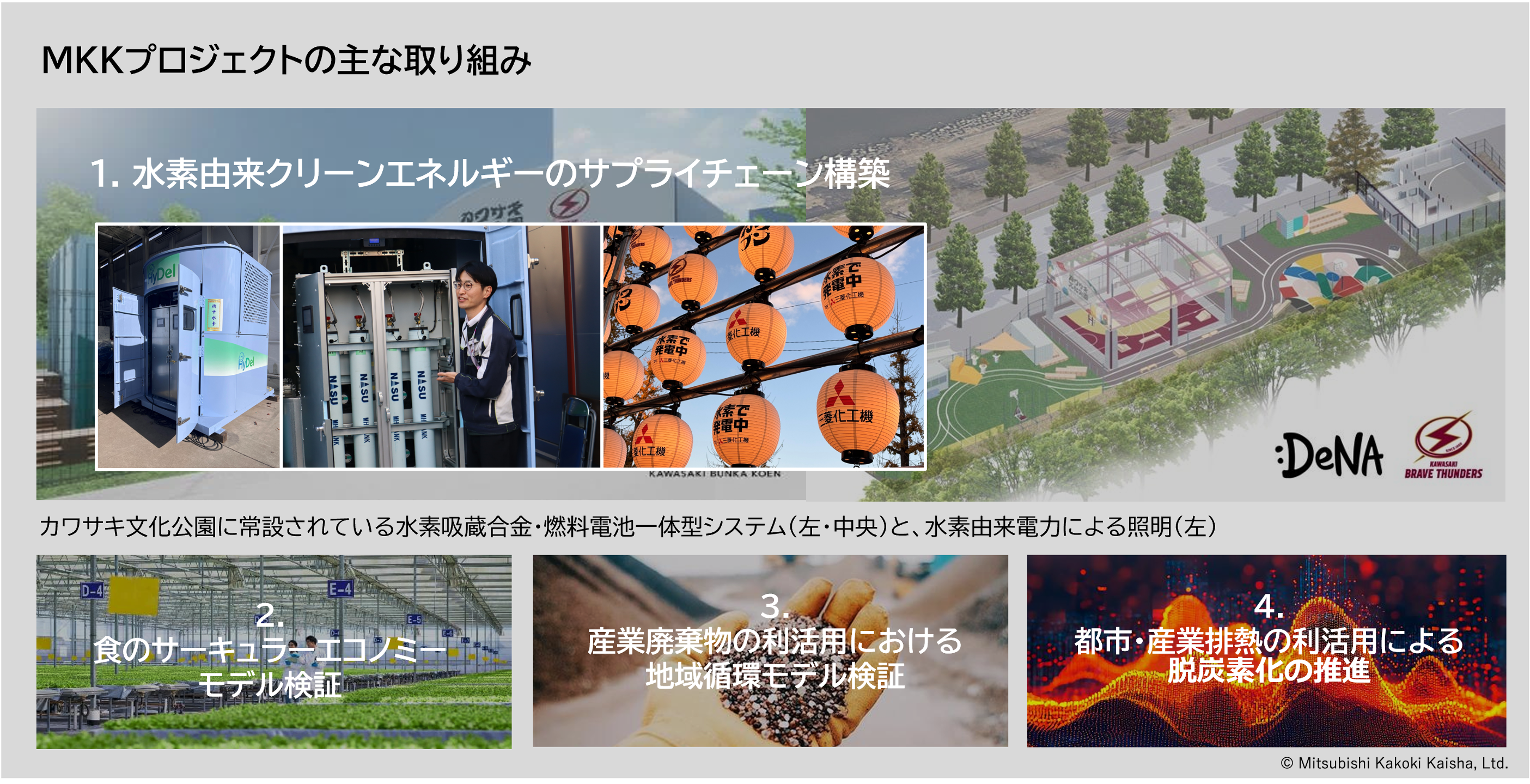 1) 圧縮機不要の省エネ、⾼い安全性があり寒冷地でも稼働可能な、⽔素による発電システム。 詳細は https://www.kakoki.co.jp/news/2025/12/08-hydel.html 2) DeNA が「川崎市若者⽂化創造発信拠点仮設整備・運営事業」の公募(2024 年3 ⽉実施)において採択され、若者⽂化創造発信拠点として2025 年9 ⽉より多摩川沿いの国道409 号道路⽤地に設⽴したアーバンスポーツ拠点
