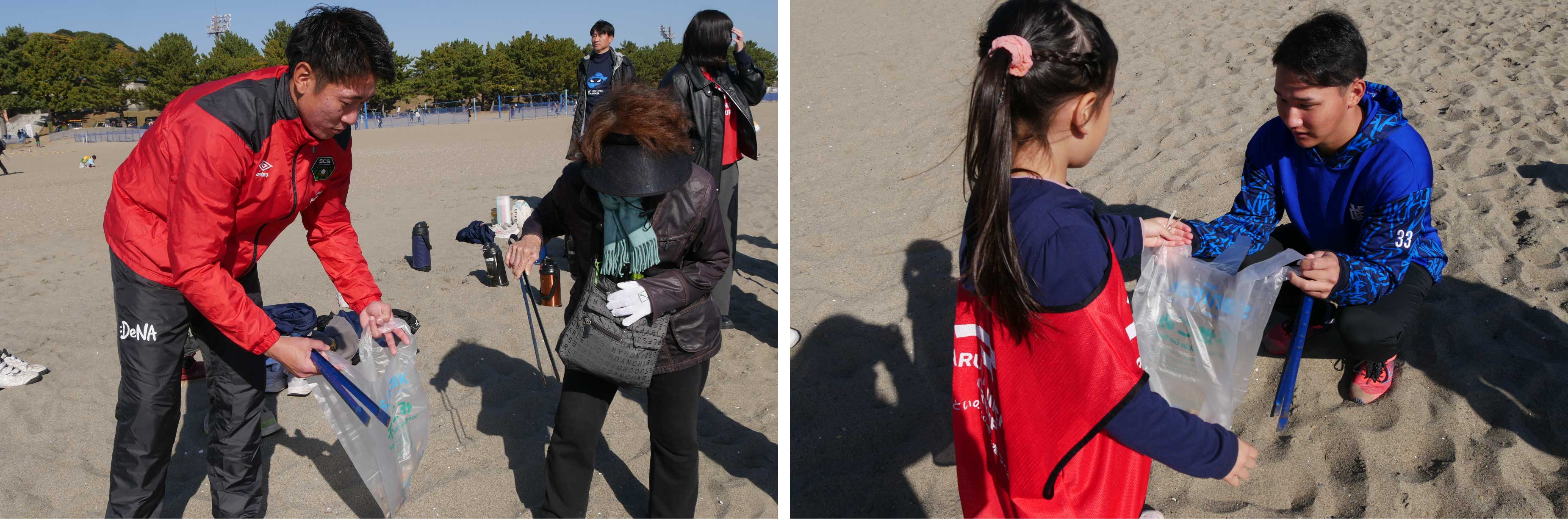 その後、選手と参加者で班に分かれビーチクリーンアップ活動を実施。選手たちも日頃応援してくださる参加者や、子どもたちとのコミュニケーションを楽しむひと時となりました。